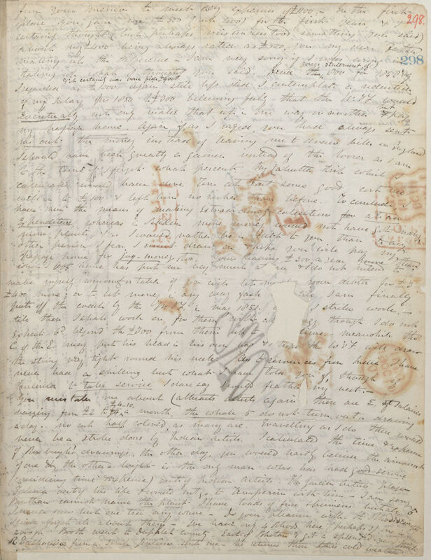 from your memo to meet my expenses of £1100. In the first place you gave me £500 not 400) for the first year, & I certainly thought (but perhaps misunderstood something you said) about £400 being always rated as £500, you my dear father making up the difference. I am very sorry if I was wrong in taking up what I thought you said. Hence the your statement of 800 for 1848 & 9 I regarded as £1000 & it certainly was bona fide £900. Again still less did I contemplate a reduction of my salary for 1850 to £300 believing fully that the W.& F. [Woods & Forests Department] would eventually not only make that up in one way or another & but pay my passage home. Again, if, as I urged, you had always sent me out the money instead of leaving me to draw bills on England I should have been greatly a gainer instead of the looser as I am to the tune of I forget what percent. My Calcutta trip which I calculated would have done Tom at least some good cost me well on to £100 & left him no richer than before. To conclude I have here the means of making extraordinary collections for at an expenditure, whereas in Sikkim more money would not have got many more plants, & as I would rather be in debt to you than any other person I fear I must draw on & hope you will pay my passage home for jug money[?] too. Your having £300 a year more than when I left home has put me very much at [hole in paper] & I do not intend to make myself uncomfortable if you will let [hole in paper]