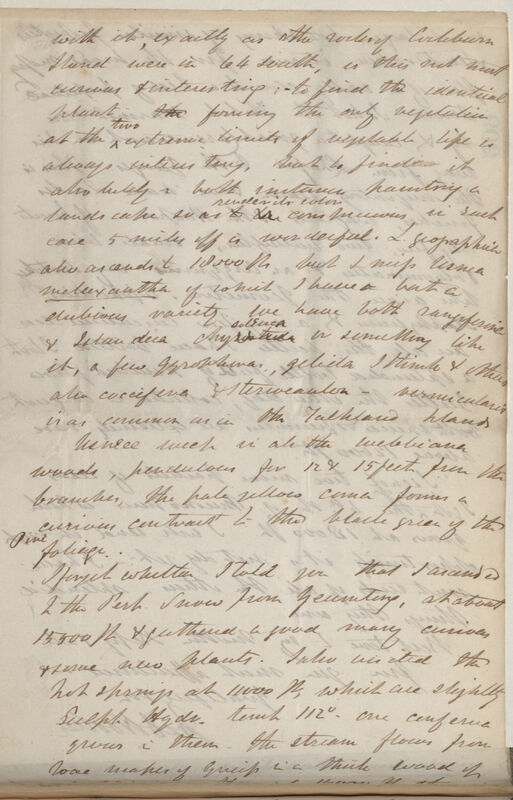 I forget whether I told you that I ascended the Perp[etual] Snow from Yeumtang, at about 15500 ft & gathered a good many curious & some new plants. I also visited the hot springs at 11000 ft, which are slightly Sulph. Hydr. Temp[aratue] 112o -- one conferva grows in them -- the stream flows from low[?] masses of Gneiss in a thick wood of webbiana -- Here are 16000 ft there is a