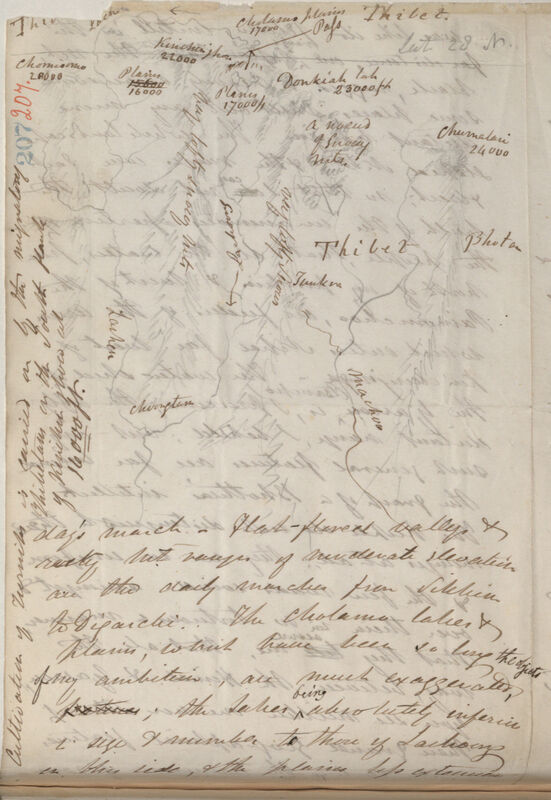 than I expected. The plains I did not think it worth while to descend to the plain at the risk of breaking my instruments; for it being is continuous with Kongra Lama which I measured, & there was no mistaking the average level from the top of the Pass to be otherwise than identical with that of the similar plains on the south face ie. about 17,000 ft. (I have no comparative observations from Darjiling [Darjeeling], yet to work by). It is moreover [1 word crossed out, illeg.] quite impossible to [1 word crossed out, illeg.] form an estimate of a surface so uneven by one or two measurements: in short, I saw nothing to be gained by the precipitous approach, but great hazard to my instruments & a dreadful accession of my already tormenting headaches.