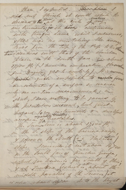than I expected. The plains I did not think it worth while to descend to the plain at the risk of breaking my instruments; for it being is continuous with Kongra Lama which I measured, & there was no mistaking the average level from the top of the Pass to be otherwise than identical with that of the similar plains on the south face ie. about 17,000 ft. (I have no comparative observations from Darjiling [Darjeeling], yet to work by). It is moreover [1 word crossed out, illeg.] quite impossible to [1 word crossed out, illeg.] form an estimate of a surface so uneven by one or two measurements: in short, I saw nothing to be gained by the precipitous approach, but great hazard to my instruments & a dreadful accession of my already tormenting headaches.