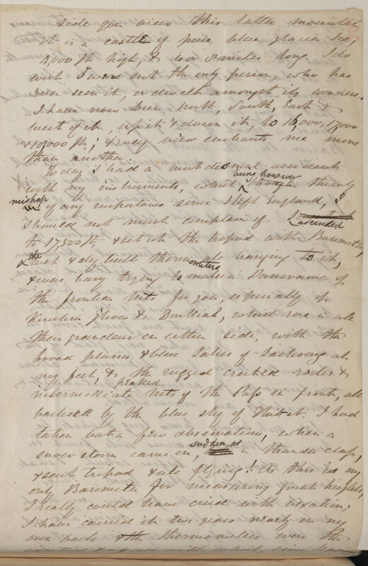 Today I had a most dismal accident with my instruments, which being however though the only [1 word crossed out, illeg.] mishap of any importance since I left England, I should not much complain of. I went up ascended to 17,500 ft. & set up the tripod with Barometer, & the wet & dry bulb thermometers all hanging to it, & was busy trying to make a Panorama of the frontier mts for you, especially of Kinchin jhow & Donkiah, which were in all their grandeur on either side, with the broad plains & blue Lakes of Lachoong at my feet, & the rugged crested rocks & intermediate peaked mts of the Pass in front, all backed by the blue sky of Thibet. I had taken but a few observations, when a snow storm came on [1 word crossed out, illeg.] sudden as a Thunder clap, & sent tripod & all flying! As this is my only Barometer for measuring great heights, I really could have cried with vexation; I have carried it two years nearly on my own back & the thermometers were the identical & only ones with which, since leaving