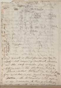 was like its fellow, untill[sic] in the far distance, one range loftier than the rest, black, rugged & heavily snowed in some places, shut out any more distant horizon. The whole landscape sloped N.W., & the ranges were East & West, so that I do can not doubt the truth of the unanimous assertion of the people, that all the waters, from north of my position & west of the Painomchoo, are feeders of the Arun, which enters Nipal [Nepal] far west of Kinchinjunga [Kanchenjunga] The water--shed of the Yarrow (Tsampo) is, I presume, the lofty distant range I beheld; but any such general features are far beyond the grasp of a Bhottan's intellect. The people do not distinguish these ranges at all,: they are so uniform & the few roads wind amongst & over them in so tortuous a manner, that they tell assure me, that all the way, between the Himal[aya]. & Yarrow, you see neither one nor other of these grand geographical features until each is the terminus of your
