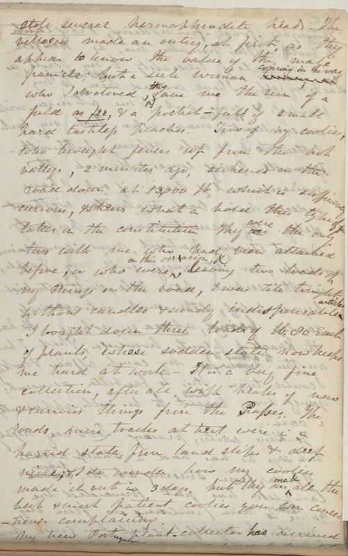 stole several hermaphrodite heads. The villagers made an outcry, at first, as they appear to know the value of the male panicle; but a sick woman hearing of coming in the way who I doctored they gave me the run of a field as fee, & a pocket--full of small hard tasteless peaches. Two of my coolies, who brought fevers up from the hot valleys, 2 months ago, sickened on the road down, at 13,000 ft, which is sufficiently curious, & shews[sic] what a hold this type of fever takes on the constitution[.] They are were the only two with me who had been attacked before, or who were, on this occcasion, & leaving two loads of my things on the road, I was till tonight without candles & sundry indispensibles articles. I brought down three loads of lb.80 each of plants, whose sodden state now keeps me hard at work – it is a very fine collection, after all, with heaps of new & curious things from the Passes. The roads, mere tracks at best, were in a horrid state from land slips & deep mire; & I do wonder how my coolies made it out in 3 days, but they are one & all the best & most patient coolies you can concei