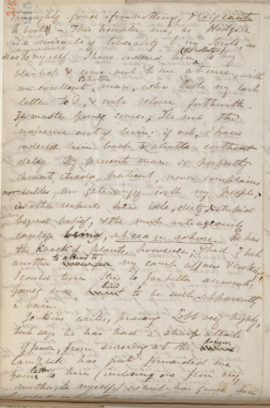 thoroughly good--for--nothing, & exigeant to boott. -- This troubles me, as Hodgson is a miracle of liberality to my Serv[an]ts, as [he] was to myself. I have ordered him (the collector) to buy blankets & come out to me at once, with an excellent Bhotan man, who took my last letter to D [Darjeeling?], & will return forthwith. If master Gomez comes, I'll rub the nonsense out of him; if not, I have ordered him back to Calcutta [Kolkata] without delay. My present man is perfectly honest, steady, patient, never complains nor sulks, nor gets angry with my people; in other respects he is idle, dirty, & stupid beyond belief, & the most outrageously careless being, at sea or ashore. He has the knack of plants, however; & had I but another man for to attend to my camp affairs & cooking, I could turn this to far better account; Gomez was brought hired to be such, -- apparently in vain.