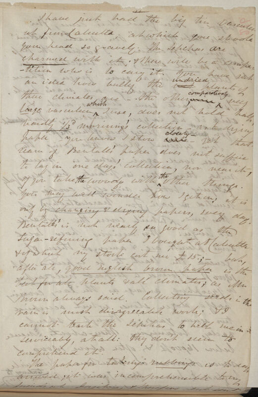 I have just had the big tin vasculum up from Calcutta, at which you shook your head so gravely. The Lepchas are charmed with it; & there will be a competition who is to carry it. You have not an idea how bulky the wet undried plants of these climates are --. the otherwise, comparatively very large vasculum which I use, does not hold half hardly 1/3d morning's collection -- as to drying paper -- you know I stow well closely -- yet that ream of Bentall's paper does not suffice to lay in one day's collection, nor near it, if you take the woods with the other things. You may well wonder how I get on; it is only by changing & drying papers, every day. Bentall's is not nearly so good as the sugar--refining paper I bought at Calcutta & of which my stock cost me £15.;-- but after all, good English brown paper is the best for all plants & all climates; as Mr Brown always said. Collecting seeds in the rain is most disagreeable work; & I cannot teach the Lepchas to help me in it serviceably at all: they don't seem to comprehend it.