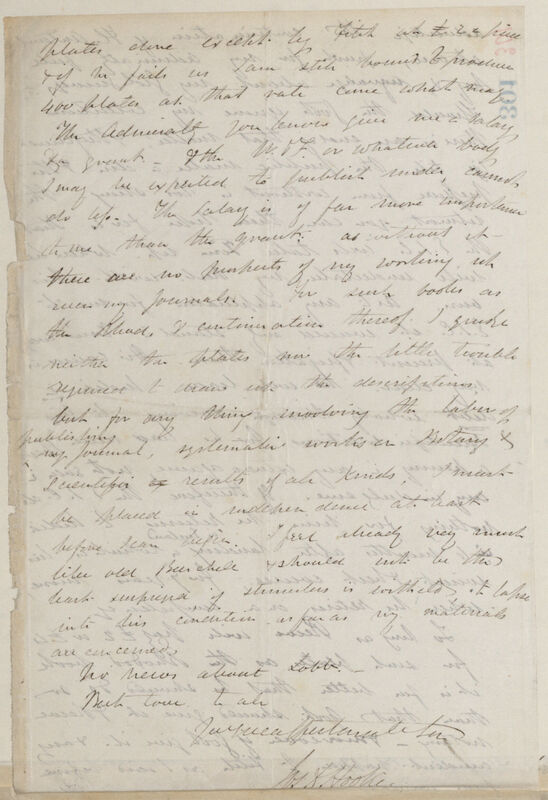 advertise the continuation of Fl[ora]. Antarct[ica]. at once, push for my Admiralty full pay & arrange about my Geol[ogical] Survey. Should the Gov[ernmen]t ignore my collections there is an end of that matter, & there must be till the public make a din & the pressure from without is too strong -- the utmost you can then hope for is that the E.I.C. [East India Company] will take Tom up. When he will undertake my herb[arium]. with his own. As to any application for me to E.I.C [East India Company] it would only stand in Tom's way at present & frighten them. His course is very clear, He will leave India in debt wholly through & owing to his scientific exertions for he has never spent a penny in any extravagance, not even in any indulgence. If therefore the E.I.C. [East India Company] do nothing for him he returns to India in 6 months after landing in England which is his wisest & best course, for 7 years more, when he retires on a competency.