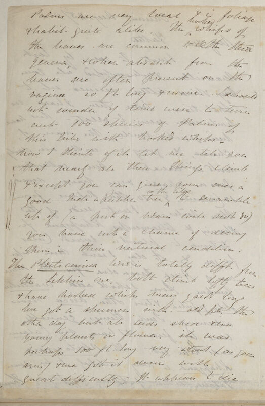 palms are very local & in foliage & habit quite alike. The hooked whips of the leaves are common to all the three genera, & when absent from the leaves are often present on the ragina[?] 20 ft long & more. I should not wonder if time were to turn out 100 species of Palms of this tribe with hooked whips. Now that I think of it let me tell you that nearly all these things climb & except you can give your ones a good India Rubber tree or the like to scramble up of (a post or beam will not do) you have not a chance of seeing them in their natural condition. The Plectocomia here is totally diff[eren]t from the Sikkim one, both climb lofty trees & have hooked whips many yards long. We got a specimen with old f[rui]t. the other day, but all seeds shed & no young plants or flower, it was perhaps 100 ft long very stout (as yours are) & we got it down with great difficulty. It appears to die
