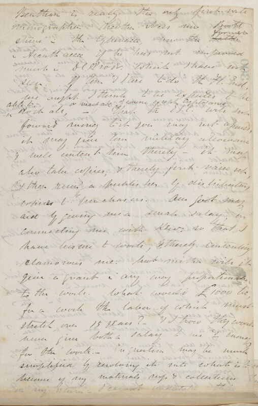 Bentham is really the only first rate monographer. Neither Nees nor Boott shine in the Cyperaceae, nor the latter former in Acanthaceae if he has not improved much in DC. [De Candolle] Prod[romus]. which I have not seen. If Tom & I are to do the Fl[ora]. Ind[ica]. we ought I think to be expected to be able to do it all, or nearly all of course except Cryptogam. That the E.I.C. [East India Company] will not forward money to it you may rest assured, it may give Tom military allowance & will content him thereby -- it may also take copies, & thereby first--raise up, & then ruin a publisher by distributing copies to purchasers. Our Gov[ernmen]t may aid by giving me a small salary, or connecting me with Kew so that I have leisure to work, & thereby contenting clamorous me, but neither will it give a grant in any way proportionate to the work. What would £1000 be for a work the labor of which must stretch over 15 years? & I know they would never give both salary to me & money for the work. -- The question may be much simplified by resolving it into what is to become of my materials mss [manuscript] & collections on my return. I cannot undertake their