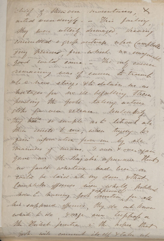 chief of their own mountains, & acted accordingly.-- This failing, they were utterly dismayed, having committed a gross outrage upon Campbells & my persons, from which no imaginable good could come.-- The only course remaining was of course to trump up a new story, & to detain us as hostages for no ill befalling Thence pending the Govts. taking active steps for our release. Unluckily they are were so simple as to let out all their secrets to me, when trying to gain information from me by all manner of means, & over & over again gave me the Rajah's assurance that no fault whatever had been or could be laid at my door & that Campbells offences were wholly political. Now C[ampbell]. having Govt. Sanction & approval for all his supposed offences, they do not know what to do, & urge our tresspass[sic] on the Thibet [Tibet] frontier in the hopes that Govt. will commit itself & take up
