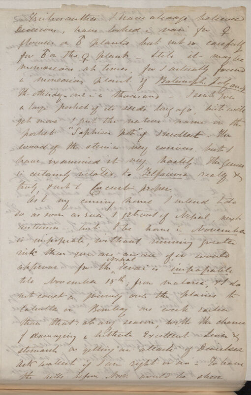 As to my coming home I intend to do so as soon as ever I get out of Nepal, next autumn -- but to be home in November is impossible, without running greater risk than you are aware of or would approve, for the Nepal Terai is impassable till November 15th; from malaria, & I do not court a journey over the plains to Calcutta *1 or Bombay *2 one week earlier than that at any season, with the chance of damaging a hitherto Excellent Liver & stomach or getting an attack of Diarrhoea[.] Ask Wallich if I am right or no -- To leave the hills before Novr. would be sheer