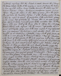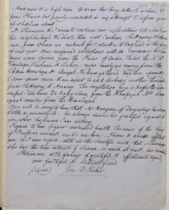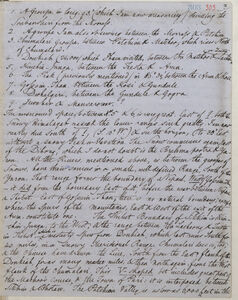 I had previously visited Thibet & spent some days North of lat. 28°., discovering the source of the Arun River, which flows from the West of the Kamtchoo Lakes, behind Kinchin--Junga, to its exit from the Mts. of Thibet in Nepaul. From what I saw, & from the very full information which I collected, I am now convinced that the Snowed Himalaya do not form an individual Mountain--Chain; but that they consist of groupes[sic] of snowy Peaks, widely separated from one another, & are parts, or individual spurs of a far more lofty range of Mountains, between the great masses of snow, & the Yarou--Tsamper river. The Southern water shed is behind all the snows, often 1/2 a degree & more; & the Thibetan frontier was along the line of watershed behind, as often as along the ridges of snow. Thibet, between the Yarou & the snow, is, as you have well described it, a lofty rugged & quite impracticable country; though none of the Peaks, North of the watershed on that line, reach the elevation of the snowy ones.