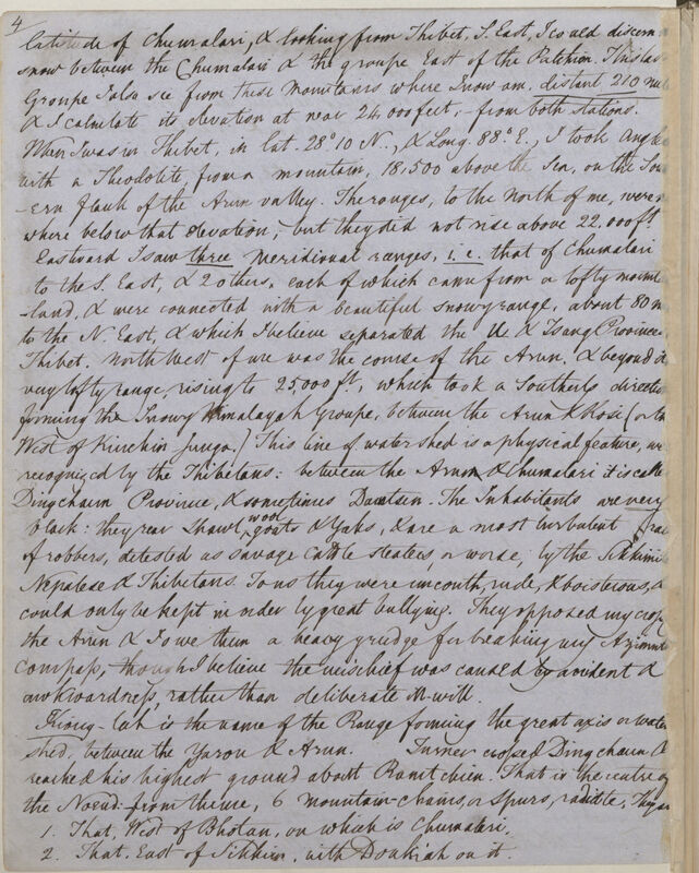 latitude of Chumalari, & looking from Thibet, S. East, I could discern a snow between the Chumalari & the groupe[sic] East of the Patchion. This last Groupe[sic] I also see from these Mountains where I now am. distant 210 miles & I calculate its elevation at near 24,000 feet;-- from both stations. When I was in Thibet, in lat. 28°.10 N.., & Long.88°.E., I took angles with a Theodolite, from a mountain, 18,500 above the sea, on the Southern flank of the Arun valley. The ranges, to the North of me, were no where below that elevation; but they did not rise above 22,000ft. Eastward I saw three Meridional ranges, i.e. that of Chumalari to the S[outh]. East, & 2 others, each of which came from a lofty mountainland, & were connected with a beautiful snowy range, about 80 miles to the N[orth]. East, & which I believe separated the U & Tsang Provinces of Thibet. North West of me was the course of the Arun, & beyond it, a very lofty range, rising to 25,000ft., which took a southerly direction forming the Snowy Himalayah Groupe[sic], between the Arun & Kosi(or to West of Kinchin--Junga.) This line of watershed is a physical feature much recognized by the Thibetans: between the Arun & Chumalari it is called Dingchaun Province, & sometimes Damtsen. The Inhabitants are very black: they rear shawl wool goats & Yaks, & are a most turbulent race of robbers, detested as savage cattle stealers, or worse, by the Sikkimites Nepalese & Thibetans. To us they were uncouth, rude, & boisterous & could only be kept in order by great bullying. They opposed my crossing the Arun & I owe them a heavy grudge for breaking my Azimuth Compass, though I believe the mischief was caused by accident & awkwardness, rather than deliberate ill will.