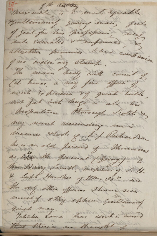 The main body will consist of Col. Innes, a very fine officer of much experience & of great bulk, not fat but huge in all his proportions thorough Scotch & very much reminding me in manner & look of Sir I.[?] Richardson he is an old friend of Thomsons as was is the General (Young) -- A Mr Harry Smith, nephew of Sir H. & Capt Hawkes of H[er] M[ajesty's] 80th are the only other officers I have seen much of & they appear gentlemanly quiet men.