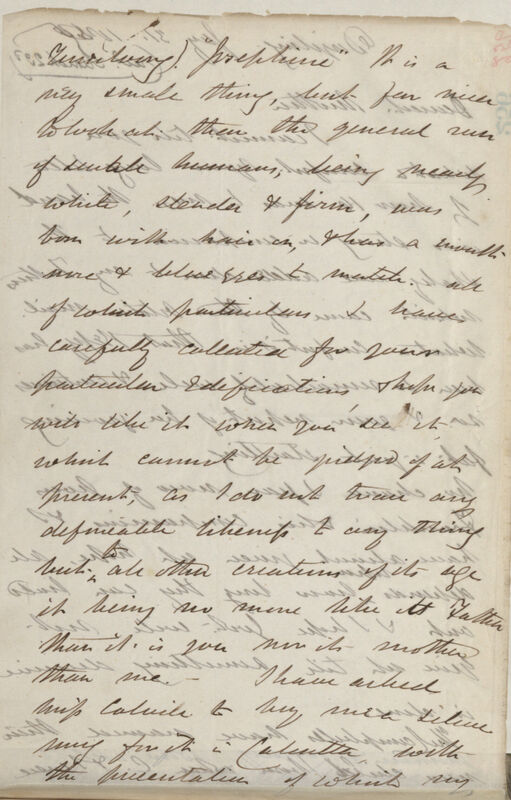 Tumloong) "Josephine" it is a very small thing, but far nicer to look at. then the general run of small humans, being nearly white, slender & firm, was born with hair on, & has a mouth nose & blue eyes to match. All of which particulars I have carefully collected for your particular identifications & hope you will like it when you see it, which cannot be judged of at present, as I do not trace any definable? likeness to any thing but to all other creations of its age it being no more like its father than it is you nor its mother than me. -- I have asked Miss Colvile to buy me a silver mug for it in Calcutta [Kolkata], with the presentation of which my