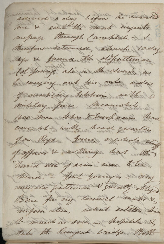 he & Mr Lushington (the special Commissioner) begged me to conduct the troops which I refused except they sent me a written request specifying the urgency of the occasion[?], which I should forward to H[er] M[ajesty's] Woods &c & meanwhile take upon me the responsibility of acting with heart & good will under the Gov[ernmen]t order. I objected on Thomson's account who had come so far to see me, & he was immediately put into order for medical duty, in the detachment (advance guard) with myself. This is a capital arrangement, for it gives him time of service in India instead of leave which he is now upon & every hour taken off the time he will have to spend in India on his return after furlough is so much added to his life