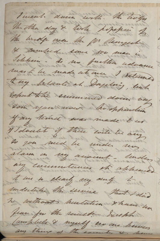 Many of the people I know from private sources are all ready & willing to come over to Dorjiling & only want our assurance that they will not be molested, to grant a peaceful march to our soldiers -- This they now have & appreciate. The Dewan has only 30 men to oppose with & all they will not help him, The Rajah has no army nor is he trying to raise one -- so that he will probably flee at our approach
