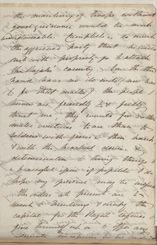 he & Mr Lushington (the special Commissioner) begged me to conduct the troops which I refused except they sent me a written request specifying the urgency of the occasion[?], which I should forward to H[er] M[ajesty's] Woods &c & meanwhile take upon me the responsibility of acting with heart & good will under the Gov[ernmen]t order. I objected on Thomson's account who had come so far to see me, & he was immediately put into order for medical duty, in the detachment (advance guard) with myself. This is a capital arrangement, for it gives him time of service in India instead of leave which he is now upon & every hour taken off the time he will have to spend in India on his return after furlough is so much added to his life