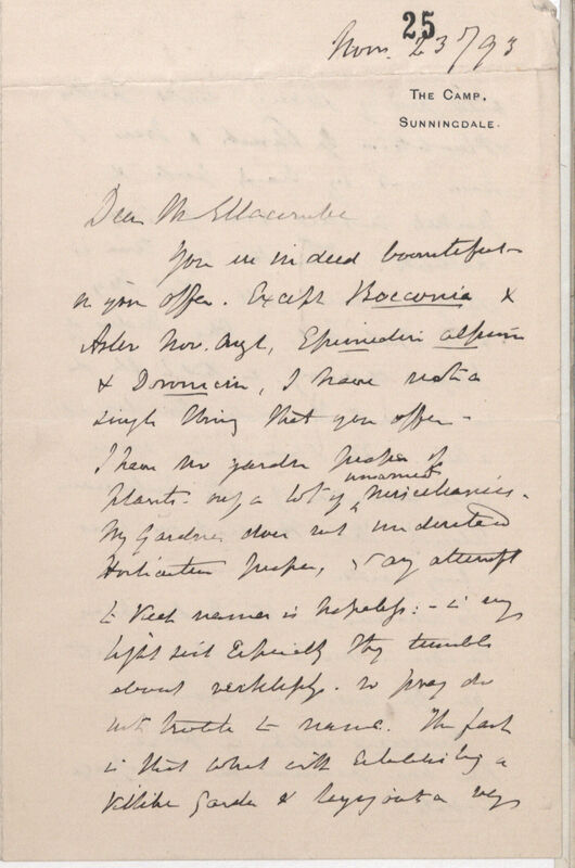 I have no garden proper of plants. only a lot of unnamed[?] miscellanies. My Gardener does not understand Horticulture proper, & any attempt to Keep names is hopeless: -- in my light soil Especially they tumble about recklessly. so pray do not trouble to name. The fact is that what with establishing a viable[?] Garden & laying out a very