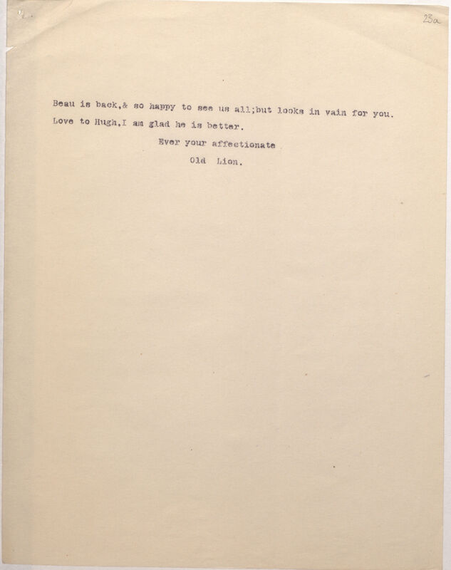Beau is back, & so happy to see us all; but looks in vain for you. Love to Hugh, I am glad he is better.