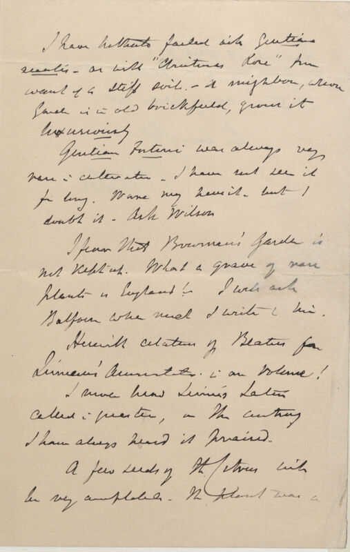 I have no garden proper of plants. only a lot of unnamed[?] miscellanies. My Gardener does not understand Horticulture proper, & any attempt to Keep names is hopeless: -- in my light soil Especially they tumble about recklessly. so pray do not trouble to name. The fact is that what with establishing a viable[?] Garden & laying out a very