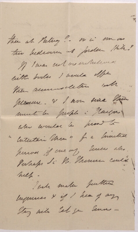 them at Putney? -- or in one or two bedrooms at Jordan Hill? If I was not overwhelmed with books I would offer them accommodation with pleasure. & I am sure there must be people in Glasgow who would be proud to "entertain them" for a limited period if one only knew who. Perhaps Sir W. Thomson could help. I will make further enquiries & if I hear of any thing will let you know --