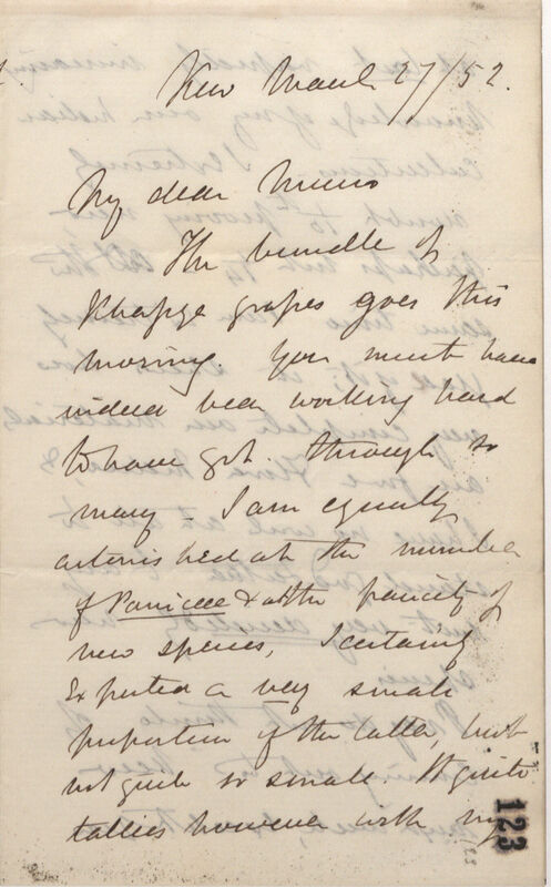The bundle of [1 word illeg.] grasses goes this morning. You must have indeed been working hard to have got through so many. I am equally astonished at the number of Paniceae & at the paucity of new species, I certainly expected a very small proportion of the latter, but not quite so small. It quite tallies however with my