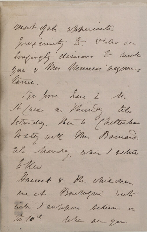 I go from here to Mr St Caves on Thursday till Saturday. then to Cheltenham to stay with Mr Barnard till Monday, when I return to Kew.