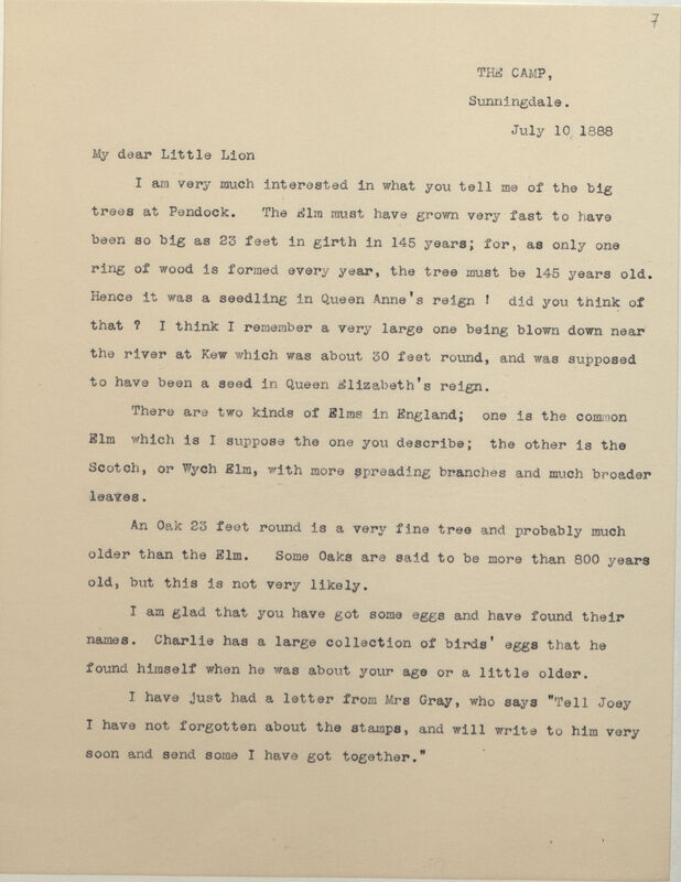 My dear Little Lion I am very much interested in what you tell me of the big trees at Pendock. The Elm must have grown very fast to have been so big as 23 feet in girth in 145 years; for, as only one ring of wood is formed every year, the tree must be 145 years old. Hence it was a seedling in Queen Anne's reign ! did you think of that ? I think I remember a very large one being blown down near the river at Kew which was about 30 feet round, and was supposed to have been a seed in Queen Elizabeth's reign.