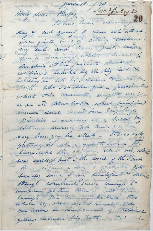 It has been raining all day & not going to clear up at all. l am quite tired of sitting working in my Tent and have just made you a drawing which I enclose of Kinchin*3 at his favourite sport of catching a Lepcha by the pig tail & holding on till he screams & calls for help. Also I enclose you a prospectus which this minute caught my eye in an old newspaper which wrapped round some bread from Darjeeling. Kinchin is growing up a brave boy but very unruly at times & when very hungry he steals -- It was only yesterday he ate a great hole in the plum- cake the children sent me, which was carelessly put in the corner of the Tent. He is fed once a day, & generally gets besides some of my breakfast & dinner though sometimes greedy enough to complain at these times of not having enough. This morning he had two whole egg-shells all to himself & do you know he complained of the pieces getting between his teeth. I told him