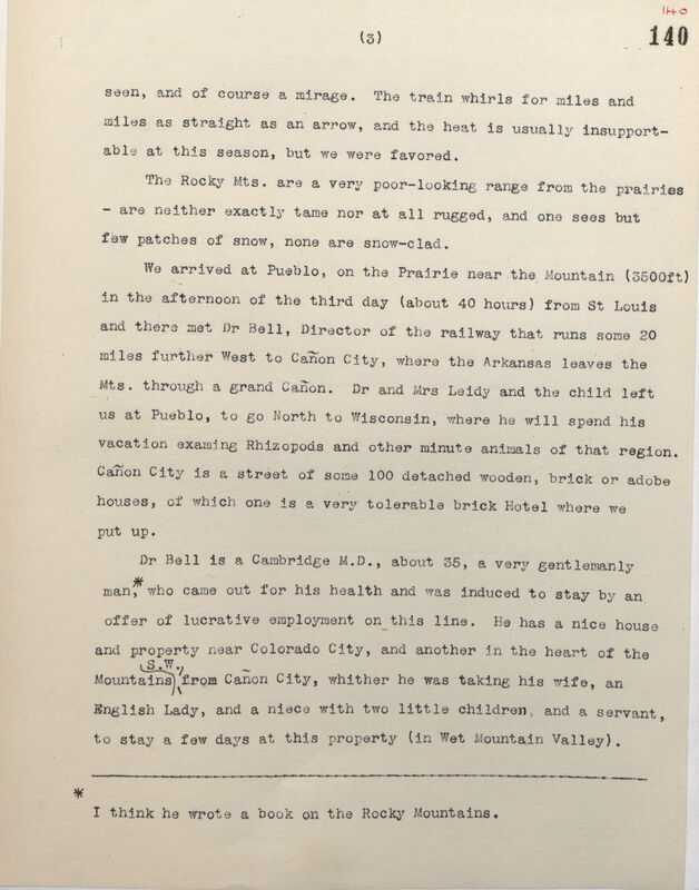 seen, and of course a mirage. The train whirls for miles and miles as straight as an arrow, and the heat is usually insupportable at this season, but we were favored. The Rocky Mts. are a very poor-looking range from the prairies -- are neither exactly tame nor at all rugged, and one sees but few patches of snow, none are snow-clad. We arrived at Pueblo, on the Prairie near the Mountain (350Oft) in the afternoon of the third day (about 40 hours) from St Louis and there met Dr Bell, Director of the railway that runs some 20 miles further West to Cañon City, where the Arkansas leaves the Mts. through a grand Cañon. Dr and Mrs Leidy and the child left us at Pueblo, to go North to Wisconsin, where he will spend his vacation exam[in]ing Rhizopods and other minute animals of that region. Cañon City is a street of some 100 detached wooden, brick or adobe houses, of which one is a very tolerable brick Hotel where we put up. Dr Bell is a Cambridge M.D., about 35, a very gentlemanly man*, who came out for his health and was induced to stay by an offer of lucrative employment on this line. He has a nice house and property near Colorado City, and another in the heart of the Mountains S[outh] W[est], from Cañon City, whither he was taking his wife, an English Lady, and a niece with two little children, and a servant, to stay a few days at this property (in Wet Mountain Valley).