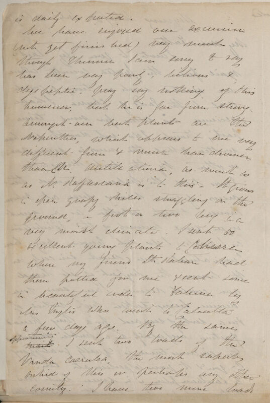 of the Sacchara on this terai & Arundo[?] folding them to lengths of 8 feet. The billets of wood are 3 feet to 4 feet --. The Palms & Pandani & Tree Ferns as big as I can get transported. Thomson is a most active help in also these matters & as he often goes out when I am drawing in doors you will be largely indebted to his aid[.]