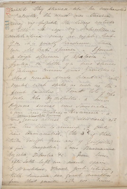 correct they should all be overhauled in Calcutta, the dead ones thrown away & if possible the living restored a little He says my Nepenthes is distillatoria & may be right, but if so, it is greatly handsomer than even McNab's specimen. I found a single specimen of Apostasia in Jyntea & a little of a new species of Falconers curious genus Gamoplexis also a curious small plantain with scarlet erect spike, as well as the fruit tomentose -- I sent lots of ripe seeds. Also Hydropeltis a new Polyosma several new Sonnerilas[sic] 2 fine Aristolochias -- Hexameria -- a new hermaphrodite flowered genus allied to vallisneria wh[ich]. Tom has been examining, a quite new Hamamelid, (the 3'd of these hills & diff[eren]t. from any of Griffiths) a fine magnolia, 2 new Burmanias Erycibe, Tupistra &c. From here after Lobb left we went again to Nunklow, & have just returned with however no great novelties from that quarter wh[ich]. we have