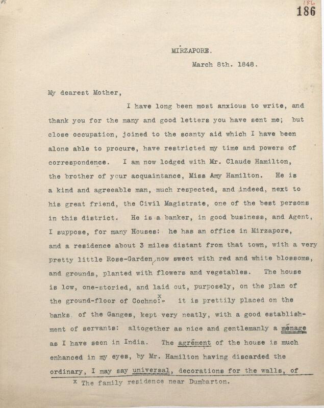 I have long been most anxious to write, and thank you for the many and good letters you have sent me; but close occupation, joined to the scanty aid which I have been alone able to procure, have restricted my time and powers of correspondence. I am now lodged with Mr. Claude Hamilton*1, the brother of your acquaintance, Miss Amy Hamilton. He is a kind and agreeable man, much respected, and indeed, next to his great friend, the Civil Magistrate, one of the best persons in this district. He is a banker, in good business, and Agent, I suppose, for many Houses: he has an office in Mirzapore[Mirzapur], and a residence about 3 miles distant from that town, with a very pretty little Rose-Garden, now sweet with red and white blossoms, and grounds, planted with flowers and vegetables. The house is low, one-storied, and laid out, purposely, on the plan of the ground-floor of Cochnox :- it is prettily placed on the banks, of the Ganges, kept very neatly, with a good establishment of servants: altogether as nice and gentlemanly a ménage as I have seen in India. The agrément of the house is much enhanced in my eyes, by Mr. Hamilton having discarded the ordinary, I may say universal, decorations for the walls, of