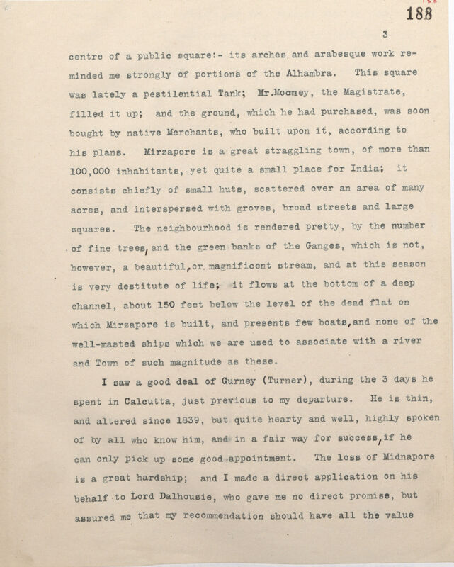 centre of a public square:- its arches and arabesque work reminded me strongly of portions of the Alhambra. This square was lately a pestilential Tank; Mr.Mooney, the Magistrate, filled it up; and the ground, which he had purchased, was soon bought by native Merchants, who built upon it, according to his plans. Mirzapore[Mirzapur] is a great straggling town, of more than 100,000 inhabitants, yet quite a small place for India; it consists chiefly of small huts, scattered over an area of many acres, and interspersed with groves, broad streets and large squares. The neighbourhood is rendered pretty, by the number of fine trees, and the green banks of the Ganges, which is not, however, a beautiful, or magnificent stream, and at this season is very destitute of life; it flows at the bottom of a deep channel, about 150 feet below the level of the dead flat on which Mirzapore[Mirzapur] is built, and presents few boats, and none of the well-masted ships which we are used to associate with a river and Town of such magnitude as these. I saw a good deal of Gurney (Turner)*2, during the 3 days he spent in Calcutta[Kolkata], just previous to my departure. He is thin, and altered since 1839, but quite hearty and well, highly spoken of by all who know him, and in a fair way for success, if he can only pick up some good appointment. The loss of Midnapore is a great hardship; and I made a direct application on his behalf to Lord Dalhousie*3, who gave me no direct promise, but assured me that my recommendation should have all the value
