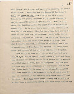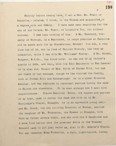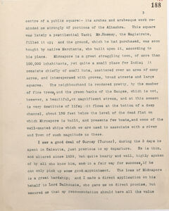 Shortly before coming here, I met a Rev. Mr. Pratt in Calcutta[Kolkata],- related, I think, to the Clowes, and acquainted, to a degree, with our family. I have made many enquiries for the son of our friend, Mr. Pratt, of Lincoln's Inn, but without success. I can hear nothing of him. A Mr. Theobald, formerly of Norwich, is a Barrister, in large practice at Calcutta[Kolkata]; and he asked much for my Grandfather, Hooker: his son, a very fine lad of 18, who is fond of Natural History, has been my companion, while I was with Mr. Williams' Survey. A Dr. Gordon, Surgeon, E.I.Co.[East India Company], has dined here: he was one of my father's pupils in 1824, and went, with his Tent Excursion to Ben Lawers: he is also 2nd. Cousin of Mrs. Smith of Jordan Hill, but had not heard of her decease, though he has visited the family, both at Jordan Hill and Helensburgh: he is a great Oriental Scholar, and was employed in important service during the wars in Scinde[Sindh?] and elsewhere. It is most strange how I meet with acquaintances. Claude Hamilton Brown, the nephew and partner of my host, used to occupy the same pew with us in Mr. Routledge's Chapel, Glasgow; he is an agreeable young man; and Mr. Clerk, the now retiring Governor of Bombay[Mumbai], married the daughter of Mr. Pinkerton, the Brewer in Glasgow, with whom my father always dealt, and who with his 2 daughters and 2 sons (the latter were the greatest dolts in the Grammar School) used to sit just below us, also in St. Andrew's Chapel. You may remember Miss Pinkerton, a fair, light-haired, lovely