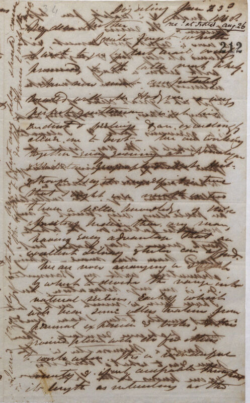 I quite forget whether I wrote to you by last mail, or only promised to, the latter most likely. I am now most comfortably located with Mr Hodgson*1, a very perfect gentleman in all his actions & feelings & an exceedingly clever one to boot --We are working together every evening at Himalayas plants[,] Geography & Natrl[Natural] History. & though I say it myself it is time that I ought in a month or two to have a better knowledge of [these?] plants of India than any man having every advantage that an excellent Library & tutor can afford. We are now arranging a [sketch?] by which to divide the range into natural sections, each of which will bear some illustration from personal experience & books, & this ground plan will do for others to work upon. It is a wonderful country & if only comparable throughout its length as interesting as the