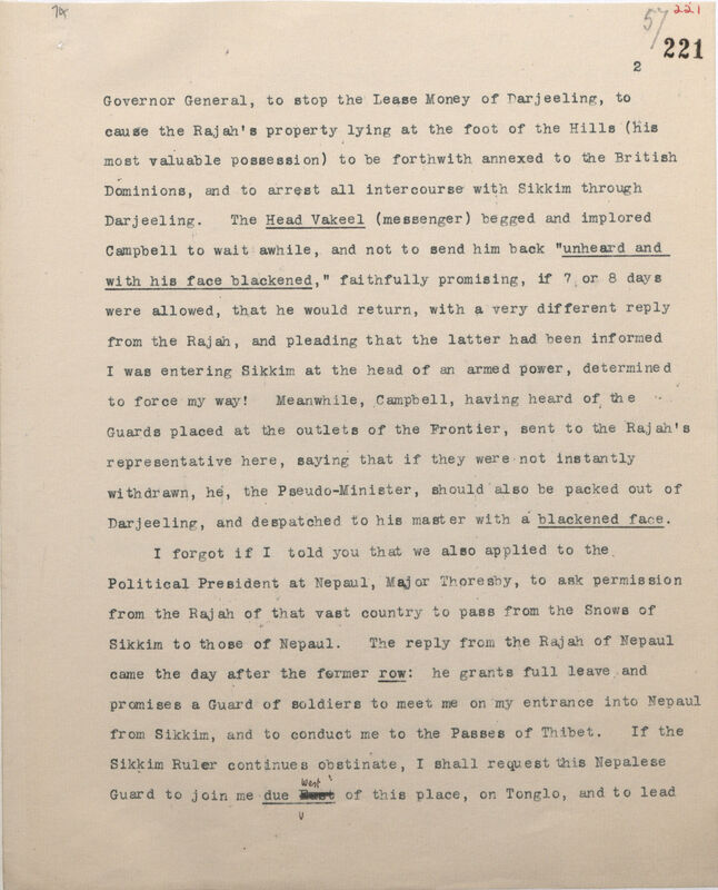 As to this letter, I would ask you not to show or say much about it; simply because it holds out high hopes of my success in gaining the Snowy Passes, which many circumstances may defeat. If I am rewarded, parts of this letter may be prefixed to the account of my expedition; if otherwise, it is best suppressed. Any notoriety given to unsuccessful applications to these contemptible Potentates would be derogatory to our Government (to whose mistakes our present pitiful position is due), that the Rajah of Sikkim, our own protected ally, who prossfesses[possesses] neither wealth, power nor authority, should rudely refuse the request of the Governor General of all India, is monstrous in the eyes of those who know nothing of Indian misrule.