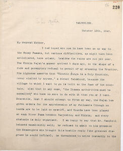 As to this letter, I would ask you not to show or say much about it; simply because it holds out high hopes of my success in gaining the Snowy Passes, which many circumstances may defeat. If I am rewarded, parts of this letter may be prefixed to the account of my expedition; if otherwise, it is best suppressed. Any notoriety given to unsuccessful applications to these contemptible Potentates would be derogatory to our Government (to whose mistakes our present pitiful position is due), that the Rajah of Sikkim, our own protected ally, who prossfesses[possesses] neither wealth, power nor authority, should rudely refuse the request of the Governor General of all India, is monstrous in the eyes of those who know nothing of Indian misrule.