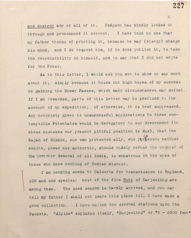 As to this letter, I would ask you not to show or say much about it; simply because it holds out high hopes of my success in gaining the Snowy Passes, which many circumstances may defeat. If I am rewarded, parts of this letter may be prefixed to the account of my expedition; if otherwise, it is best suppressed. Any notoriety given to unsuccessful applications to these contemptible Potentates would be derogatory to our Government (to whose mistakes our present pitiful position is due), that the Rajah of Sikkim, our own protected ally, who prossfesses[possesses] neither wealth, power nor authority, should rudely refuse the request of the Governor General of all India, is monstrous in the eyes of those who know nothing of Indian misrule.