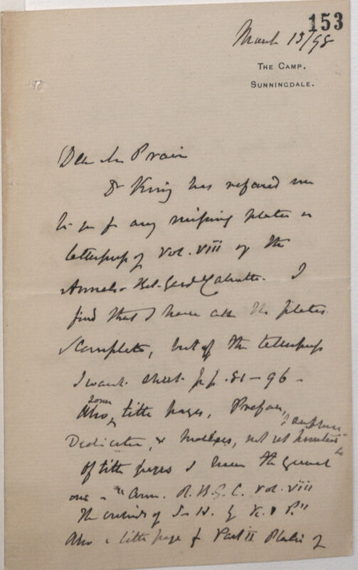 Dr King has referred me to you for any missing plates in letterpress of vol. viii of the Annals. Bot. Gard. Calcutta. I find that I have all the plates complete, but of the letterpress I want sheet[s] pp 81-96. Also some title pages, Preface, Dedication & homages[?], not[?] set[?] [illeg.] I suppose. Of title pages I have the general one - Ann. R.B.G. C. vol. Viii[.] The contents of S. H by K. & B. Also a little page of Part II Plate 2