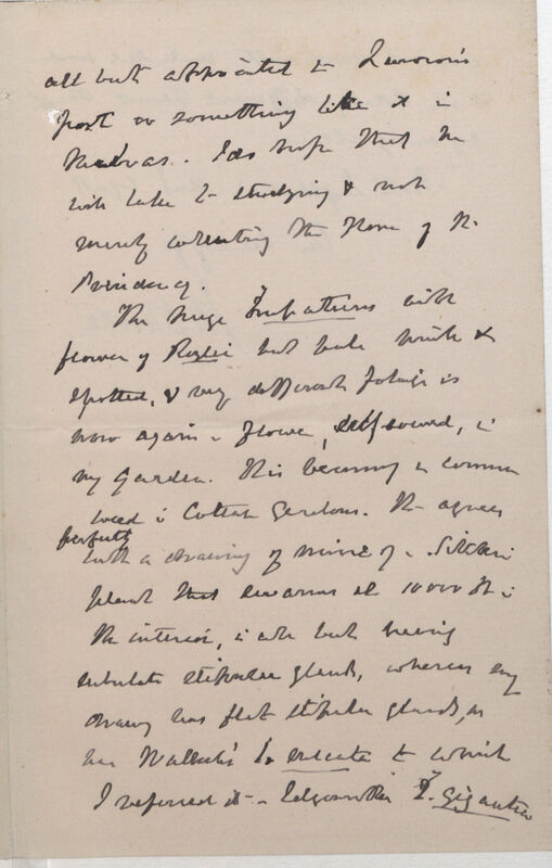 all but appointed to [a] Laborious[?] post or something like it in Madras. I do hope that he will take to studying & not merely collecting the flora of N[orth] Presidency. The huge[?] Impatiens with flower of Roylei[?], but pale pink and spotted, & very different foliage is now again in flower, self renewed[?], in my garden. It is becoming a common weed in Cottage Gardens. This agrees perfectly with a drawing of mine of a Sikkim plant that swarms at 10000 ft in the interior, in all but having subulate stipular glands, whereas my drawing has flat stipular glands, as per Wallich's*4 I. sulcata to which I referred it. -- Edgeworth’s I. gigantea