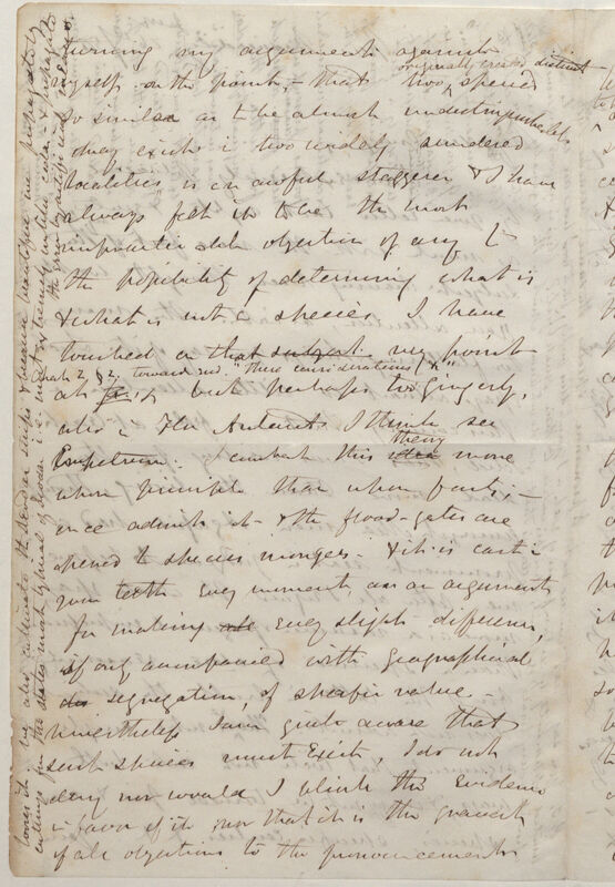 turning my argument against myself on the point that two originally created distinct species so similar as to be about undistinguishable may exist in two widely sundered localities is a awful staggerer & I have always felt it to be the most impracticable objection of any to the possibility of determining what is & what is not a species. I have touched on that subject very point at Chap 2 paragraph 2 toward end "These considerations &c" for & but perhaps too gingerly, also in the Flora Antarct[ica] I think see Empetrum. I combat this idea theory more upon principle than upon facts;-- once admit it & the flood--gates are opened to species mongers & it is cast in your teeth every moment as an argument for making all every slight difference, if only accompanied with geographical des segregation, of specific value -- nevertheless I am quite aware that such species must exist, I do not deny nor would I blink the evidence in favor of it: nor that it is the greatest of all objections to the pronouncements
