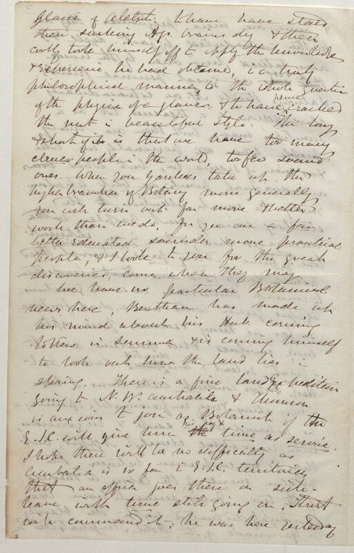 glacier of Aletsch: to have have[sic] staid[sic] there sucking Ag[assiz's]. brain dry & then coolly took himself off to apply the knowledge & experience he had obtained, is a truly philosophical manner to the question of the physics of a glacier & to have hence cracked the nut in beautiful style. The long & short of it is that we have too many clever people in the world, too few sound ones. When you Yankees take up the higher branches of Botany more generally you will turn out far more & better work than we do, for you are a far better educated sounder more practical people, & I look to you for the great discoveries, come when they may.