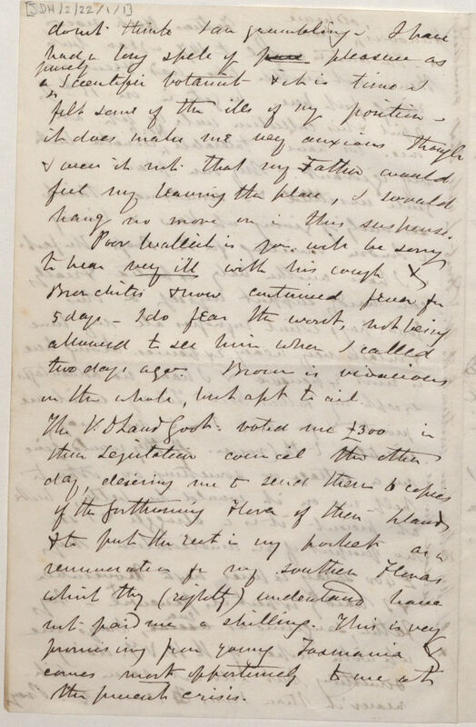 The V[an] D[iemen's] Land*4 Gov[ernmen]t voted me £300 in their Legislation council the other day, desiring me to send them 6 copies of the forthcoming Flora of their plants[?] & to put the rest in my pocket as a renumeration[sic] for my southern Floras which they (rightly) understand have not paid me a shilling. This is very promising from young Tasmania & comes most opportunely to me with the present crisis.