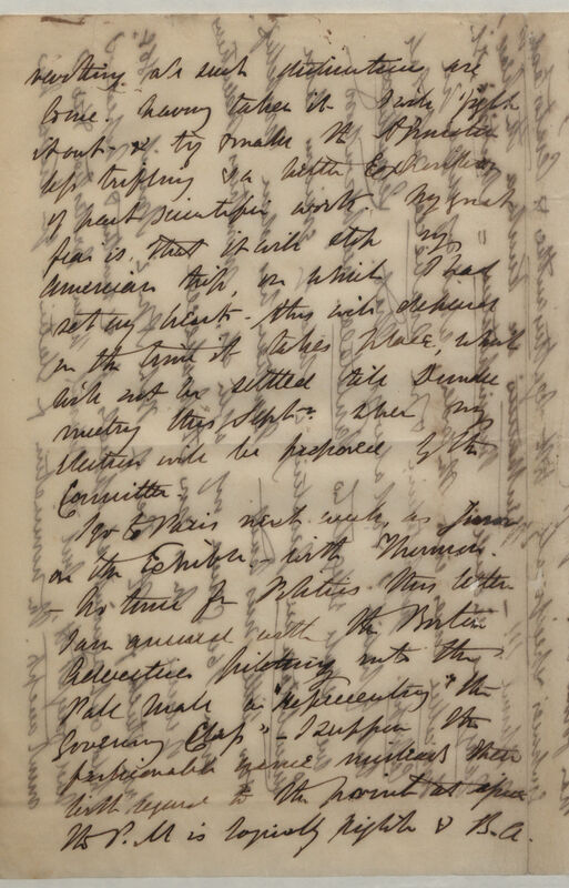 revolting all such distinctions are to me, having taken it I will fight it out & try & make the association less trifling & a better exposition of past scientific work, my great fear is that it will stop my American trip, on which I had set my heart -- this will depend on the time it takes place, which will not be settled till Dundee meeting this Sept:-- when my election will be proposed by the committee. I go to Paris next week as Juror on the Exhibin*5. -- with Thomson. No time for politics this letter.