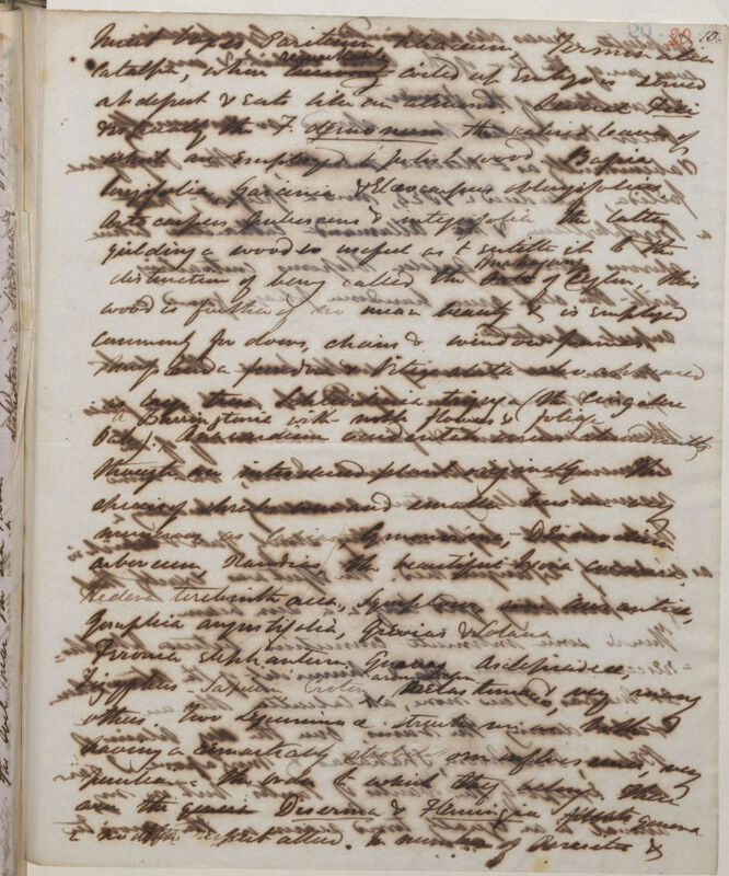 fruit[?] boxes, Paritinea liliaceum, Terminalia Catalpa, whose curiously remarkable coiled up embryo is served at dessert & eats like an almond. Several Fici & especially the F.dernonum the scalerid leaves of which are employed to polish wood. Bassia longifolia , Garcinia & Elaeocarpus oblongifolias, Artocarpus pubescens & integrifolia the latter yielding a wood so useful as to entitle it to the distinction of being called the Oak Mahogany of Ceylon, this wood is further of no mean beauty & is employed commonly for doors, chairs & window frames. Mussaenda frondosa & Viteza alata also appeared as large trees. Schleichera trijuga (the Cingalese Oak). A Barringtonia with noble flowers & foliage Anacardium occidentale occurs abundantly though an introduced plant originally. The species of shrubs around smaller trees are very numerous, as Cassias, Grumesena, Desmodium arborium, Randias, the beautiful Lyona Cocanea, Hedera terehinthacea, Symploros, some Aurantica, Geruphia angustifolia, Grewias & Solana, Feronia elephantum. Guams Asclepiadea, Zizyphus -- Sapium, Croton aromaticam, Melastomaceae, & very many others. Two Leguminae a struck me as both having a remarkably strobilosum inflorescence, very peculiar in the order to which they belong. These were the genera Diserma & Flemingia plants genera in no other respect allied. In numbers of Parasitic &